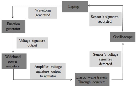 It is essential to evaluate the quality of concrete in construction and evaluate strength development during maintenance. In particular, early age maintenance intensity monitoring is very important for reducing construction costs and construction time, as it provides information needed for decision-making so that the next process can progress safely. SAs can monitor the strength development of concrete at the curing stage, and monitor the existence and severity of damage during the service life of concrete structures [112]. The typical experimental set-up of wave propagation (WP) technology is shown in Figure 9. The configuration consists of a laptop computer equipped with arbitrary waveform generation software, which allows users to generate transient waves and time spans of specific shapes and frequencies. An ultrasonic device was developed for damage detection and crack identification and was used to monitor the early age of concrete [113,114,115]. The main limitation of the device is that tests can only be carried out in a fixed design mold; therefore, on-site concrete monitoring is not permitted. Kim et al. [116] proposed a non-destructive curing strength gain monitoring method based on guided waves for early concrete, and derived a formula for estimating the curing strength of non-destructive tests [112].