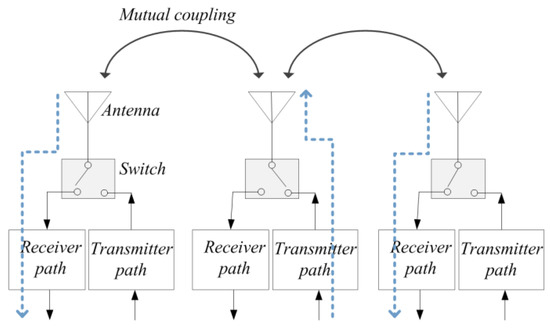 The antenna structure of a typical phased array. The receiver and transmitter share an identical antenna. The switch controls the transform between receiving mode and transmitting mode. A mutual coupling exists between adjacent antennas.