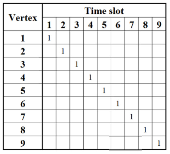In phase two, we use an allocation matrix to derive the number of time slots that each calibration needs, where the matrix’s row represents each vertex and the matrix’s column represents the allocated calibration time slots (colors). The maximum number of allocated calibration time slots equals the number of vertices when every vertex occupies a time slot. Each grid in the allocation matrix can have three values: 1, 0, and blank, which is defined as follows: