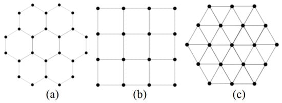 Three antenna topologies for planar arrays. (a) Hexagonal tiling. (b) Square tiling. (c) Triangular tiling.
