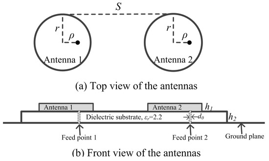 Figure 10 shows the dimension of circular patch antennas in the first simulation. Various types of patch antennas with omnidirectional radiation patterns are available [30,31,32,33,34]. We chose a circular patch antenna [30] as the implementation architecture for validation.