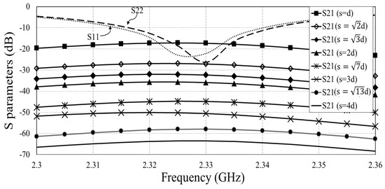 The simulated mutual coupling results at 2.33 GHz with different S.