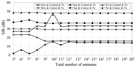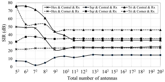 First, we evaluate the case where the antenna located at the center of the array being activated as a transmitter to calibrate its one-hop neighbors. This corresponds to the receiver path calibration as described in Section 2.3. The calibration signal and interferences are generated at the feeding points of each transmitter antenna with an identical frequency and phase. After propagating through different distances, all interferences are superimposed at a one-hop neighbor antenna of the central antenna, which is in receiving mode and the received calibration signal’s SIR can be calculated. We implement this simulation over arrays with different topologies and different number of antennas, whose simulation results are represented by three solid lines in Figure 12. This is the worst condition because the antennas under calibration receive the strongest interference. Second, we evaluate the case where the antenna located at the corner (e.g., top left) of the array serves as the calibration signal transmitter and its one-hop neighbors are the antennas under calibration. We calculate the calibration signal’s SIR received by these antennas, whose results are shown as the dotted lines in Figure 12. The legend “Hex & Central & Tx” represents the simulation results when the central antenna is configured as a calibration signal transmitter for arrays with hexagonal topologies. Other legends can be interpreted in a similar fashion.