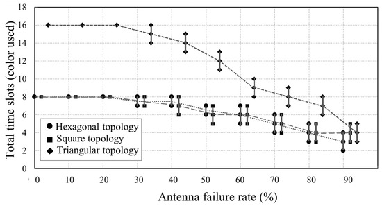 Simulation of the total time slots for arrays with different antenna failure rates.