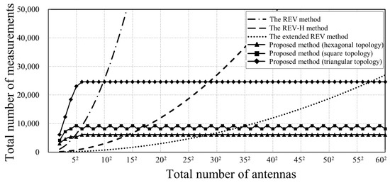 Comparison of the total number of measurements between the REV method, the REV-H method, the extended REV method and the proposed method with different topologies.