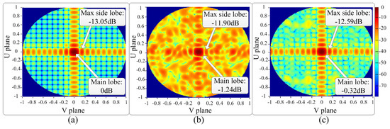 The radiation pattern comparison before and after our proposed calibration is shown in Figure 17. A square-tilted planar array is used in this comparison. Initially, every antenna is identical without any amplitude and phase errors. The radiation pattern of this ideal phased array is shown in Figure 17a. The maximal side lobe power is 13.05 dB lower than the main lobe beam. The plot is central symmetric perfectly. Then every antenna is assigned with random amplitude and phase errors. The standard deviations of amplitude and phase errors are 3 dB and 120 degrees, respectively. The radiation pattern is shown in Figure 17b. Without any calibration, the main lobe power deteriorates by 1.24 dB compared to Figure 17a, and the maximal side lobe power is 1.15 dB higher than the side lobe in Figure 17a. Furthermore, the average power of the side lobes is much higher than Figure 17a (the green and dark blue areas in Figure 17a turn into red and yellow in Figure 17b). To calibrate this phased array, the proposed calibration time allocation method is implemented on this phased array. Hence, each antenna is assigned to a certain time slot. As a result, multiple antennas perform local calibration processes at the same time slot to obtain the amplitude and phase errors among their one-hop neighbors. The SIR of each calibration signal is shown in Figure 12 and Figure 13. After all antennas have been calibrated, the system obtains amplitude and phase errors among all antennas. These known amplitude and phase errors are further trimmed out by electronic circuits or digital signal processing. The radiation pattern after calibration is shown in Figure 17c. The recovered main lobe is 0.92 dB higher than that in Figure 17b, and the maximal side lobe power is improved by about 0.69 dB. Also, the average sidelobe power is much lower than that in Figure 17b.