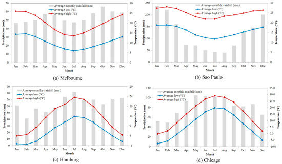 The climate characteristics of mean precipitation, mean maximal, and mean minimal temperature for each month are also illustrated in Figure 2. A brief description of the climate characteristics and urban development of each city is provided, as follows. Melbourne is the capital city of the Australian state of Victoria and the second most populous city in Australia [40]. Melbourne is located on the large natural bay of Port Phillip and expands into the hinterlands. Spring in Melbourne lasts from September to November, followed by three other seasons that are each three months long. Figure 2a shows that the temperature in Melbourne is relatively higher and the rainfall is relatively lower in the summer. Sao Paulo is the capital of Sao Paulo State in Brazil and it is populous with rapid urbanization, poor quality housing, and poor access to infrastructures, such as water, electricity, and sewage. Sao Paulo has a monsoon-influenced humid subtropical climate and four seasons that are not distinct. Generally, summer is from October to March and winter is from May to August (Figure 2b). Hamburg is one of the largest cities in Germany and the European Union. Hamburg is located in the center of Europe and it has become the center of German news media and industrial manufacturing. Hamburg is known as the gateway to Germany [41]. Hamburg is mild and humid all year. The annual rainfall is 774 mm and rainy days account for 52 days each year on average. In the fall and winter seasons, there is often stormy weather. The hottest month is July with an average temperature of 17.4 °C, and January is the coldest month with a monthly average temperature of 1.3 °C (Figure 2c). Chicago is a metropolitan city in Cook County, Illinois, USA. Under a humid continental climate, the characteristics of the four seasons are distinct. In Chicago, spring is mild, and it is also the wettest season, which spans from March to May. Deciduous vegetation begins to grow leaves in mid-April. Summer is hot and humid. Summer spans June, July, and August. The highest temperature of the year always appears in July. The low mean temperature of below freezing leads to snow coverage during most of the winter period (Figure 2d).