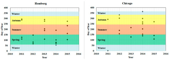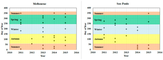 The data sources in this study included Landsat Thematic Mapper (TM), Landsat Enhanced Thematic Mapper Plus (ETM+), and Landsat Operational Land Imager (OLI) data over five years for each city from 2011 to 2015. The Landsat program is one of the most successful missions jointly initiated by U.S. Geological Survey (USGS) and NASA, and it has been serving for the resources mapping, environmental monitoring, and habitability assessment globally since 1972 [42]. In this study, all Landsat 5 TM, Landsat 7 ETM+ scenes, and Landsat 8 OLI scenes are processed through the Level 1 Product Generation System (LPGS). Initially, all images without clouds or with few clouds (less than 30%) were collected from the EarthExplorer platform of USGS, and the cloud-free images over the study sites were refined. Landsat 7 SLC-off ETM+ images were destriped by considering the radiometric characterization of the on-orbit reflective bands [43]. As the stripes are mainly located on the eastern and western edges of each scene due to the scan line corrector failure, the middle area of the scene was selected as the study site to reduce the impacts from the stripes [28]. Atmospheric correction was not applied to the time series Landsat images in this study. Although the multitemporal images were collected in different seasons when the sun-illumination conditions were different, the post-classification change detection analysis strategy was adopted where each image was classified individually with separate training samples. Furthermore, all selected images were cloud free over the study sites. This case was referred to as a classification where the training data and the image were at the same relative scale, and thus, atmospheric correction has little impact on the classification results [44,45,46,47]. Therefore, atmospheric correction is unnecessary in these post-classification change studies [44,48,49]. Subsequently, the images were preprocessed with calibration and geometric correction. Co-registrations were conducted in all images of each city by manually selecting the ground control points (GCPs) with root mean square error (RMSE) values less than one pixel. The co-registration was conducted using the second-order affine transformation implemented in Harris Geospatial’s ENVI software. The temporal distribution of the Landsat images is shown in Figure 3. Each dot represents one image. The day was represented according to the day of year, which is a number ranging from 1 to 365 or 366 in a leap year (e.g., 2012). A total of 93 images were finally selected for the four cities, including 30 images in Melbourne, 22 images in Sao Paulo, 21 images in Hamburg, and 18 images in Chicago. Almost every year had images from each of the four seasons, while some seasons did not have available images due to cloud contaminations, such as the year 2012 in Melbourne, 2011 in Sao Paulo, 2012 in Hamburg, and 2011 and 2013 in Chicago. Especially, for Hamburg and Chicago, there was almost complete snow coverage throughout the winter. Consequently, it was difficult to identify other land cover types from the winter images, and thus only a few winter images were selected for this study. In this study, only one image in 2014 was available in Hamburg, and three images in 2011, 2012, and 2014 were available in Chicago.
