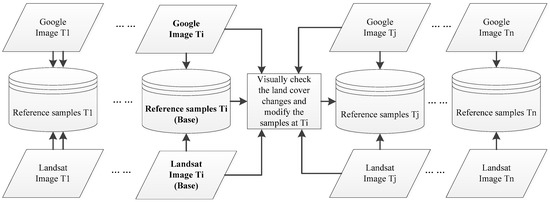 Then, reference samples of each land cover type were collected for each image individually. To keep the samples consistent in different images at different times, a two-step strategy was applied following previous studies [19,51,52,53]. First, a set of samples was collected from the first image under the stratified random sampling scheme [54,55] by visual interpretation over the Landsat image and a corresponding high-resolution image at the nearest time from Google Earth. The visual interpretation over joint Landsat and Google Earth images was assisted with support of ENVI 5.0, which creates KML files of each Landsat images. Afterwards, the KML files were overlaid with the Google Earth images to be visually interpreted. These samples from the first image were treated as the base reference samples. Second, the base samples were checked for if they exhibited any changes in other classes. If there were changes, the sample was removed, or the label was reassigned, and new samples from surrounding sites with more confidence were added [53]. These new samples were treated as the base reference samples for selecting the references samples in the adjacent image. Figure 4 illustrates the generation of reference samples at time Tj based on the reference samples at time Ti. According to similar previous methods of sample collection for time series images, this strategy could reduce the biases that were possibly caused by the sample by using sample pixels that remained the same at different times to train the classifier [19,51,52,53]. Finally, a total of approximately 800 pixels for each land cover class were selected for each image. Subsequently, these samples were empirically divided into training and testing samples with a ratio of approximately 40% vs. 60%.
