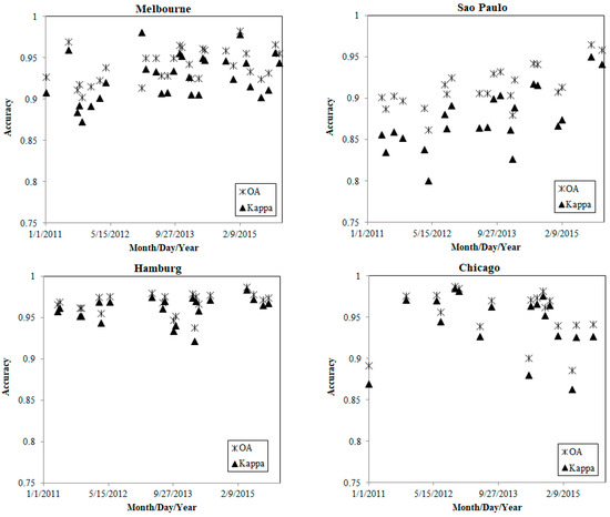 Figure 5 demonstrates the overall accuracy and kappa values for all 94 images over the four cities and the complete time series. First, it was observed that the images were distributed from 2011 to 2015, and the overall accuracy varied from ~86% to ~98% in the different cities, while the kappa values varied from ~0.8 to ~0.98 in the different cities. Generally, Figure 5 indicates that the classification results were reliable with an overall accuracy greater than 86% and a kappa value greater than 0.8. The distribution patterns of the overall accuracy and kappa values were generally consistent, with some slight differences. Second, the accuracy tended to be higher in Hamburg and Chicago than Melbourne and Sao Paulo. Most of the classified images in Hamburg and Chicago reached an overall accuracy of 94% and a kappa coefficient of 0.9. However, most of the classifications in Melbourne and Sao Paulo had overall accuracies of less than 94% and kappa coefficients that were less than 0.92.