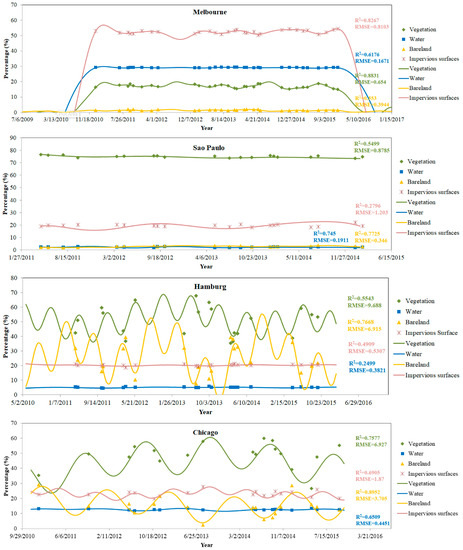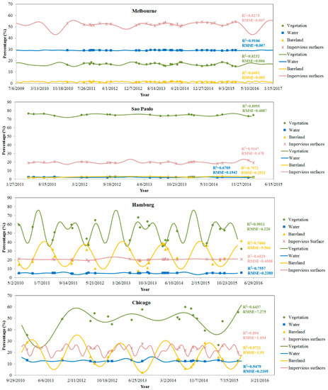 Several interesting findings can be observed from Figure 6. First, the R-squared value was generally higher than 0.64 for all fittings, and the RMSE was lower than 2%, except for the vegetation and bare land in Hamburg (~4% and 5%, respectively) and vegetation in Chicago (~7%). This result could indicate that the fittings of the Fourier series in all four cities and the different land cover types were good enough to characterize the change features. Second, the landscape patterns are very different in the four selected cities, which can be reflected by the percentages of different land cover types in the four cities. For instance, in Melbourne, impervious surfaces constituted approximately 50% of the study area, water approximately 30%, vegetation approximately 18%, and bare land only approximately 2%. In Sao Paulo, vegetation made up to more than 75% of the study area, while impervious surfaces covered approximately 20% and water and bare land covered approximately 2.5%. Third, the impervious surfaces indicated some fluctuations during the five-year period that appeared to be related to some seasonal factors. This phenomenon is more obvious in Melbourne and Chicago than in the other cities. In particular, the seasonal effect on impervious surfaces in Chicago was more obvious than that in other cities. Although the impervious surfaces were not supposed to exhibit such rises and falls, this phenomenon was also previously reported in Ohio and Indiana, USA [30,31]. The seasonal changes of other land cover types can explain this phenomenon, which can lead to land cover confusions in different seasons. This result can be examined in two aspects: (1) the seasonal changes in precipitation (Figure 2), which directly result in seasonal changes in water surfaces; (2) the seasonal changes in bare land and vegetation are obvious within the five years in Figure 6.