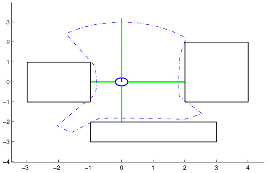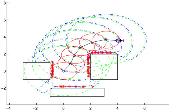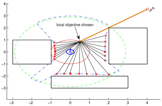 Example illustrating the VP (green line) for a case where , and the set of points, , detected (red asterisks) that avoid the obstacles.