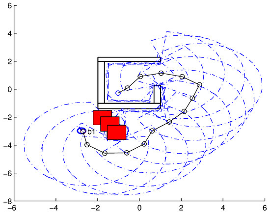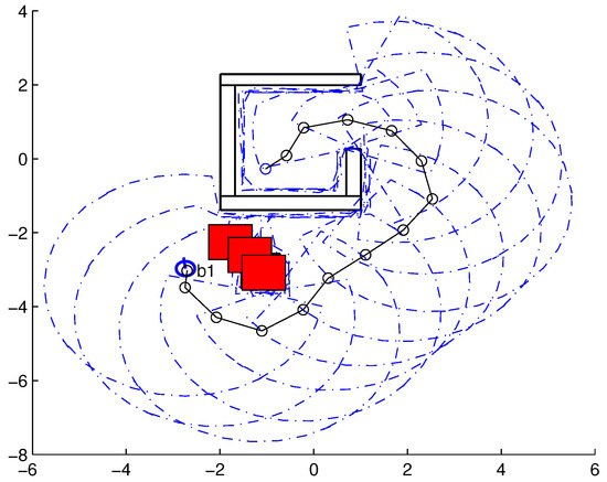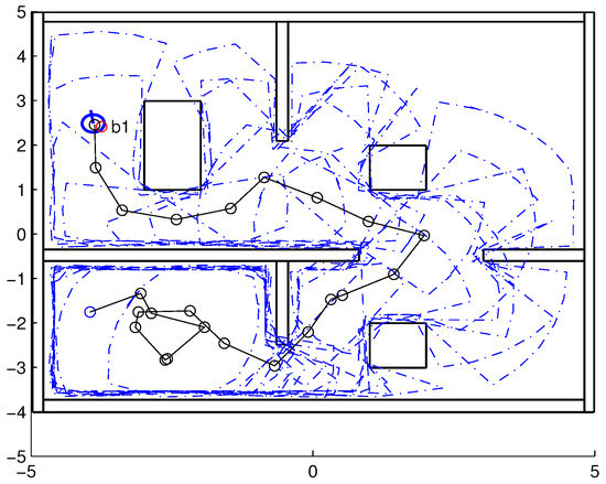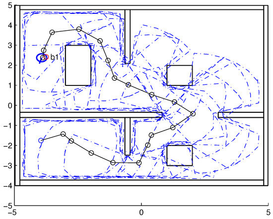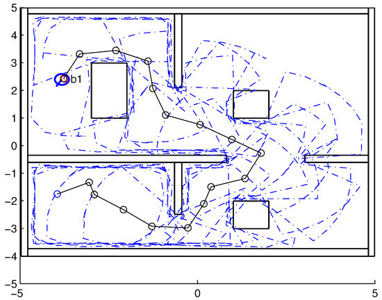 Eight simulations were made, four for environment (simulations , , , and ) and four for environment (simulations , , , and ). For each simulation, Table 2 and Table 3 show the data for the length of the route, , travelled by the robot (in meters), the processing time associated with all the displacements along the route, (in seconds), and the number of displacement events, M. The displacements of the robot in each simulation are illustrated in Figure 5, Figure 6, Figure 7, Figure 8, Figure 9, Figure 10, Figure 11 and Figure 12, where the route is indicated by a continuous black line, the m displacement events are shown as circles along the route lines, and the DPs associated with each displacement are indicated by dashed blue lines. The simulations were performed using a computer with a CPU (Intel(R) Core(TM) i5-3210M), clock speed, and of RAM.