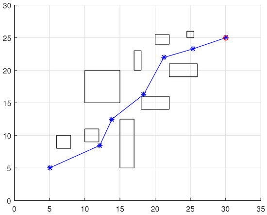The evaluation function, presented in Equation (13), follows the same principle as the potential fields technique [24], in which (the Euclidean distance between the j-th individual and the final objective, ) represents a traction force to the final point, and (the smallest Euclidean distance between the j-th individual and all the points associated with the obstacles) represents the greatest force of repulsion between the j-th individual and all the obstacles encountered. At the end of H generations, the point with the smallest evaluation function is selected as the local objective, , associated with the m-th displacement event.