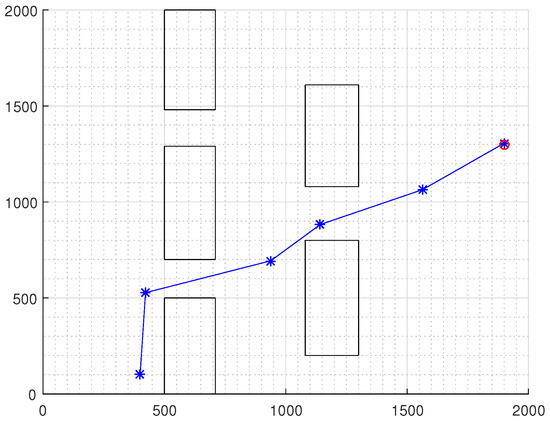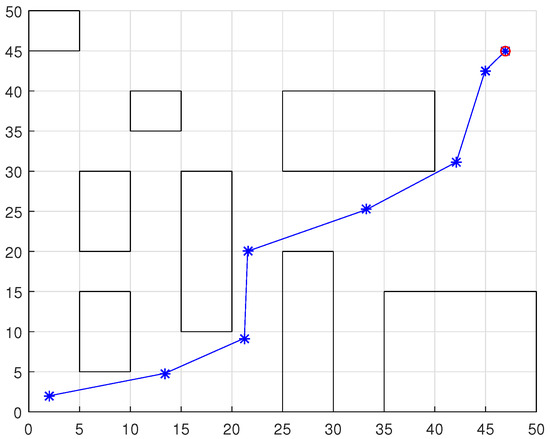 To compare the results with other works in the literature, the DPNA-GA was simulated with environments used in works presented in Refs. [9,13,14,17,21]. Figure 13, Figure 14, Figure 15 and Figure 16 show the displacement of the DPNA-GA in the environment proposed in Refs. [9,13,14] and [17,21], respectively. Table 4 shows the parameters and the results of the DPNA-GA in the environments shown in the Figure 13, Figure 14, Figure 15 and Figure 16. Finally, Table 5 compares the result between the DPNA-GA and the literature works presented in Refs. [9,13,14,17]. Each simulation (Figure 13, Figure 14, Figure 15 and Figure 16) was executed ten times, and the results are associated with the best cases. The genetic parameters for DPNA-GA were , and , corresponding to the best configuration found in the simulations with static environment (see Table 2, ). The techniques compared were the Improved Genetic Algorithm (IGA) [9], the Matrix-Binary Codes-based Genetic Algorithm (MGA) [13], the Ant Colony Optimization (ACO) [14], the ACO with the Influence of Critical Obstacle (ACOIC) [14], the Firefly algorithm [17] and the Fuzzy System [21].