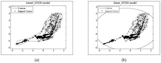 Figure 3 shows the decision model trained by the two algorithms under the random data set with 181 data objects generated by the Gaussian function N(0,1), where, all the data are 2D-dimentional, 160 data objects are normal and 21 data objects are outliers. In addition, the dimension of the random feature space is D = 10. Figure 3a shows the trained decision model of the kernel_SVDD algorithm. The support vector points accurately reflect the training dataset region. The contour line is the hyper-sphere in the feature space. Figure 3b is the trained decision model of TRFF algorithm under the random feature dimension D = 10. There is a mismatch between the model and the training dataset region, which does not reflect the characteristics of the region where the training dataset is located. If this model is used for outlier detection, it will inevitably lead to false positive alarms. Contrasting Figure 3a,b, there exists a big difference between the support vectors of the kernel_SVDD and the TRFF decision model.