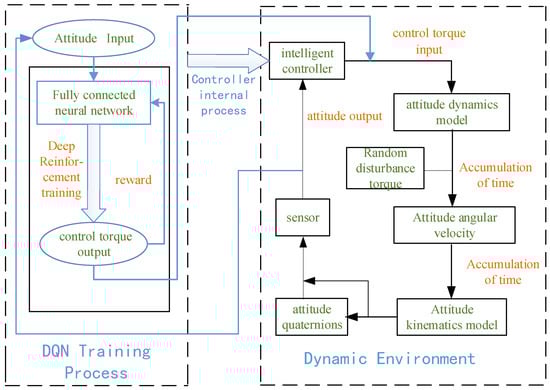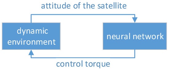 Aiming at the attitude control in such complex situations, Yoon H et al. proposed a novel control law for a nonlinear Hamiltonian MIMO (Multiple-Input Multiple-Output) system, aiming at the existence of inertial uncertainty in spacecraft attitude control []. Queiroz M S D et al. designed the nonlinear adaptive control method using the dynamic model of the complete system and proved that the global stability of tracking error of the closed-loop system converges when the interference is unknown []. Miao et al. used an adaptive sliding mode control strategy to solve the vibration problem in the process of maneuvering large flexible spacecraft []. However, the current attitude control algorithms for spacecraft are lacking in modern computational intelligence tools as they are usually designed for specific applications that do not have universal applicability. Therefore, with the continuous increase in the complexity of space exploration missions, it is necessary to design an attitude control method with considerable intelligence.