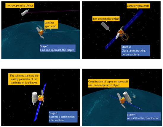 Figure 2 shows the visualization results of a typical process from our simulation environment, where the capturer spacecraft is capturing a non-cooperative object in space. The object usually has an unknown flight state, possibly spinning with unknown angular velocity, and unknown mass parameters. After the capturer spacecraft has successfully captured the object, the combined objects have unknown angular velocity, and the mass parameters, such as the centroid of the combination, will become unknown as well. The proposed method tries to re-stabilize the combination in such situations.