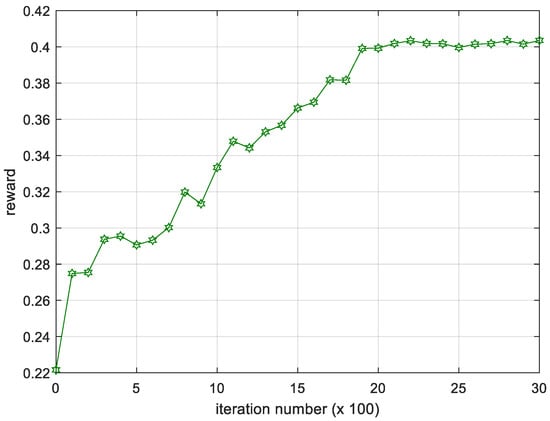 We calculate the average results of the reward value per 100 iterations in different experiments and show the changing trend of reward. As shown in the Figure 4, we can see that from the 500th iteration, the average reward is increasing rapidly. When the 2000th iteration is reached, the reward value has stabilized and has only small fluctuations. The fluctuations are mainly caused by constant disturbance. After entering the stationary period, there is not much improvement, which shows that the training is converged after about 2000 iterations.