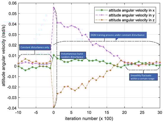 If there is no constant disturbance, the attitude angular velocity of the satellite after DQN training will return to the initial stable value after the convergence is stabilized, that is, at the 2000th iteration. However, due to the existence of constant disturbance, the attitude angular velocity will still fluctuate within a certain range, and the range of amplitude variation will be reduced by a little before the occurrence of the instantaneous disturbance under the action of DQN.