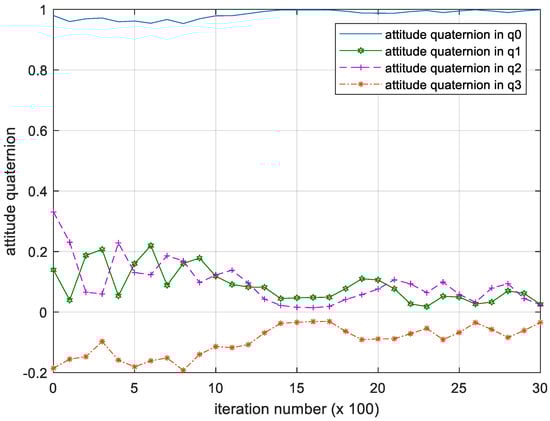 Iteration process of the attitude quaternion. Please note, the iteration number in this figure reflects the time span of the experiment.