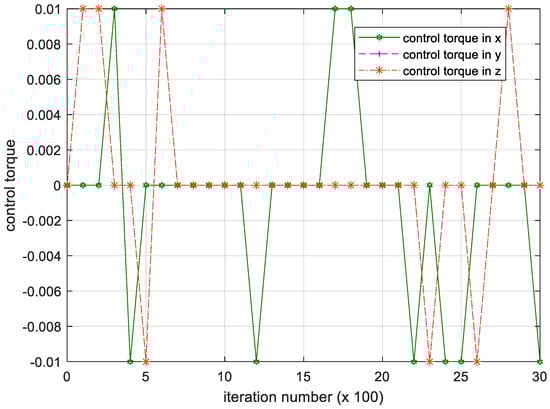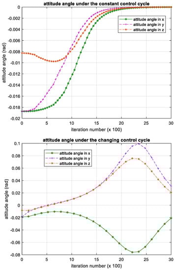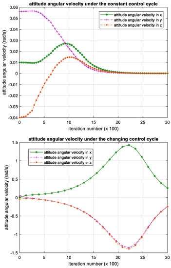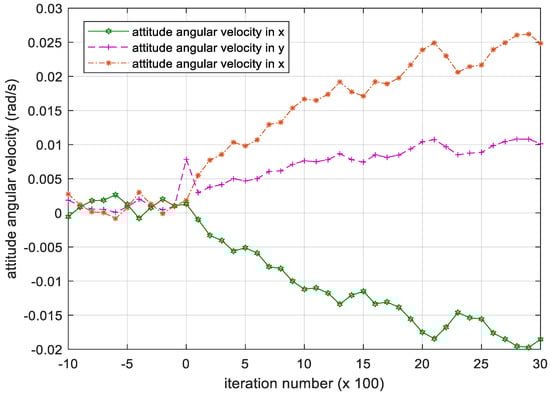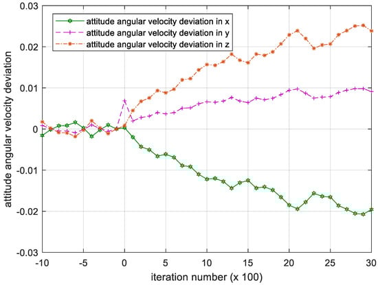Figure 11 demonstrates that the attitude angular velocity gradually increases as the number of iterations increases, failing to converge. This divergent deviation between the attitude angular velocity and the desired attitude angular velocity shown in Figure 12 indicates that the satellite cannot maintain the attitude stabilization.