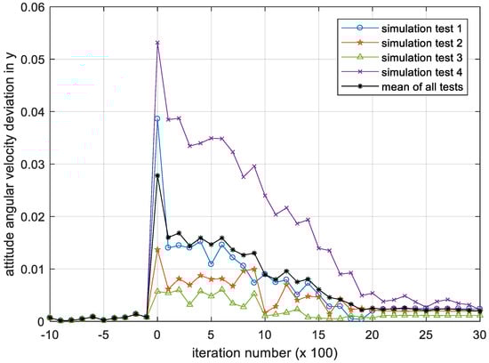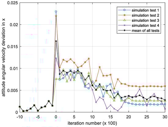Figure 8, Figure 9 and Figure 10 show the iterative process of the attitude angular velocity deviation in the three-directional components under four simulation experiments. It can be seen from all tests that as the number of iterations increases, the mean value of the deviation in the x, y and z axes all shows a downward trend and gradually converges to a stationary state, indicating that the DQN-based attitude control method has the performance advantage of stabilizing the attitude of the satellite in the case that the parameters are difficult to identify.