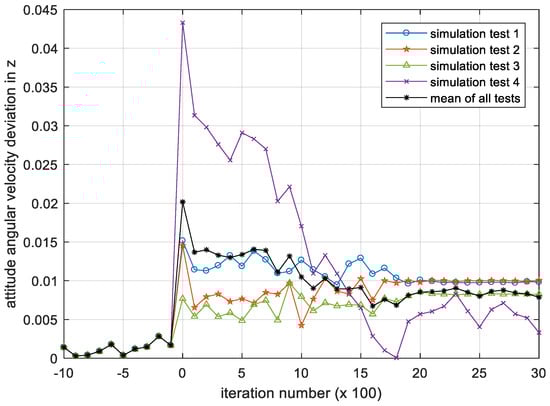 Iteration process of the attitude angular velocity deviation in z. Please note, the iteration number in this figure reflects the time span of the experiment.