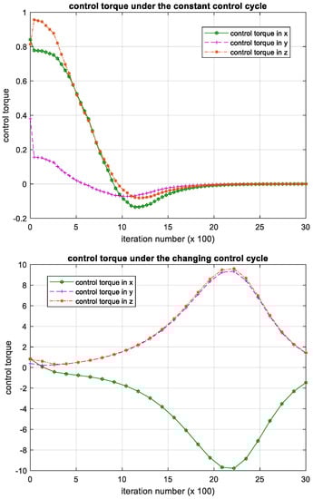 To verify the effectiveness of the proposed method, simulation experiments were performed. Firstly, the dynamic model based on constant disturbance is used to simulate the movement of satellites in space. Then, to simulate the tasks such as target capture or payload release performed by satellites, an instantaneous burst random disturbance torque is applied to the satellite based on the above dynamic model, and the moment of inertia has randomly been changed to simulate changes in satellite mass parameters at the same time. The proposed method subject to parametric uncertainty should continuously output control torque in this state to control the satellite to restore a stable flight attitude. In this paper, is the moment of inertia matrix of the satellite, which reflects the mass parameters of the satellite, and is a symmetric matrix with a positive and largest diagonal elements. To simulate changes in satellite mass parameters, is randomly been changed by adding a lower order 3 × 3 random symmetric matrix based on a basic matrix , each element in the random symmetric matrix is drawing from an uniform distribution with range of [0,1].