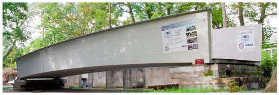 Composites compete with standard materials like concrete, steel, or wood. Composites are primarily much lighter than conventional materials and do not erode, which is crucial for constructions exposed to an aggressive environment. In the considered bridge, the spans have a sandwich-type support structure. The core is foam and coatings built from laminated fiber-reinforced polymer in the form of sandwich panels. The sandwich panel skins and lips are from the flame-retardant vinyl-ester resin as a matrix, and E-glass fabrics as its reinforcement. The polyethylene terephthalate foam core of the sandwich panel has a thickness of 100 mm and a density of 100 kg/m3. Due to significant local actions, which cannot be sustained by foam, the core in the support area consists of fiber reinforced polymer. The bridge in the longitudinal and transverse directions has chopped strand ribs inside the core. The total mass of the footbridge superstructure is 3200 kg. The bridge has a low-elevation pseudo-arch, simply supported by the span of a U-shape channel section with auxiliary lips. The bridge was designed to meet specific parameters, such as the weight, bearing capacity, and conditions needed to achieve specific bearing capacity, comfort of use, attractive architectural design, durability, non-flammability, weather resistance, UV radiation resistance, chemical and electrical insulation, ease of assembly and disassembly, and easy repair and maintenance. The composite bridge span is one of the unique constructions made entirely as one piece. This method involves vacuum resin impregnation and thanks to the infusion process, color, texture, and the decorative element can be included, which does not exclude casual surface painting. The bridge was devised and assembled within the “FOBRIDGE” project (Gdansk University of Technology: Project Leader, Warsaw Military University of Technology. Roma Private Limited Company: footbridge manufacturer). More information about the project can be found in the references [8,9]. The image of the bridge, along with the schematic cross-section and side view, are shown in Figure 1 and Figure 2a,b, respectively.