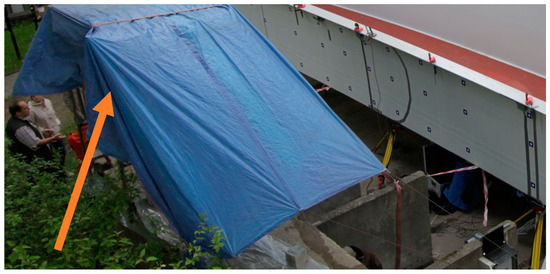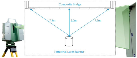 The experimental set-up was in the middle of the span, two meters from the center of the bridge diaphragm. The scheme of the measurement station is shown in Figure 3. The position of the scanner is fixed, as shown in Figure 4.