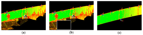 The images show a view of the point cloud in the following phases: (a) before pre-processing; (b) fenced area for deletion; and (c) after pre-processing.