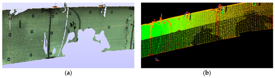 Due to various additional measurements that were carried out during proof loading, the lateral surface of the bridge was often obscured by the people crossing the view line between the bridge span and the scanner device. Obstacles between the bridge and a scanner caused the formation of rifts in the point cloud, so-called shadows, as shown in Figure 6a. These may result in an unstable distribution of points in the point cloud. We predicted the occurrence of such a situation, which is why we made several scans for each load case change. Points acquired in additional scans were used to fill the rift, as shown in Figure 6b.