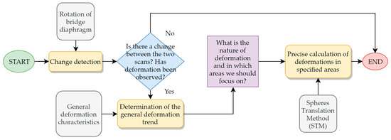 This paper presents a general framework for the deformation study of bridges, with a clear indication of the bridges that are subject to very irregular deformation, such as composite bridges. We propose a solution which combines rough change estimation, virtual visual inspection, and STM analysis, giving the advantages of both quickly change estimation and precise deformation measurement. We describe the test set-up configuration, the procedure of pre-processing and post-processing of the point cloud data, and the extensive literature review for point cloud processing, mesh modeling, and change detection. We gathered point cloud data during the proof loading process from a fixed scanner position by a Leica ScanStation C10 terrestrial laser scanner. We performed the first scan before and after the load of the bridge for the various load cases during proof loading. Our algorithm has three steps: The first step is to check if there has been a change in the considered object between the two points in time. We did a quick, rough assessment of whether the change occurred in the object by comparing two facets generated with the FM algorithm. Rotation of facets for different points in time indicates the occurrence of a deformation. Once we know that a deformation exists, we can perform a virtual visual inspection of the bridge by superimposing two mesh models in one model space to see the nature of the distortion. Checking the kind of deformation gives knowledge in which areas it is worth focusing on during accurate measurements, such as STM analysis, as these are time-consuming. We presented how to efficiently perform a virtual visual inspection of the bridge for two points in time. The third step is taking accurate measurements using point cloud processing. We adapted the STM to perform a detailed analysis of the deformations and adjusted the method for field use. We modified the STM by analyzing the object in three sections, which helped to cover most of the bridge diaphragm surface. The method was designed for concrete element deformation under monotonous load in our previous studies [40]. We compared the results from the STM with the results obtained using a total station and the deflectometer, and found they were similar. The advantages of the method proposed by us are a much broader insight into the deformation state of the object for different load cases in comparison with the total station and the deflectometer, which is especially significant in the examination of composite bridge diaphragms as they deform irregularly in a direction perpendicular to the diaphragm lateral surface. Additionally, TLS measurements are much faster than those taken with Total Station and the deflectometer. The downsides of this solution are the sensitivity to changes in the position of the scanner, weather conditions, point cloud density fluctuations, rifts in the point cloud, and improper scanning, and the need for troublesome data processing. The issue of complex shape analysis for the composite structures presented in this paper is significant, and we would like to develop it further. Further work will include the designation of procedures for large-scale bridges, as well as the improvement of existing methods.