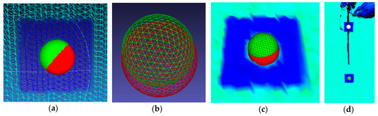 Spheres translation method: (a) mesh grid of the bridge diaphragm surface with displaced spheres; (b) mesh grid; (c) bridge diaphragm surface with displaced objects; and (d) flat signals on the bridge diaphragm surface.