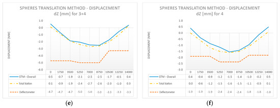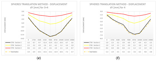 The profile position was based on the approximate position of spheres located in the closest vicinity of the cross-section. We calculated the displacements of the spheres by applying results from individual load cases to a reference sphere’s position from the case before the load was applied. We present the deformations of the composite bridge diaphragm lateral surface in the perpendicular direction for different load cases in Figure 13a–f (STM in three sections compared with total station measurements), and the vertical displacements in Figure 14a–f (STM in three sections, total station measurements, and deflectometer). We show the data for individual areas of the composite bridge diaphragm lateral surface, which is divided along the length of the bridge into equal sections with lengths of 1.75 m. We decided to adopt the length of 1.75 m because this value corresponds to the placement of markers used for total station measurements.
