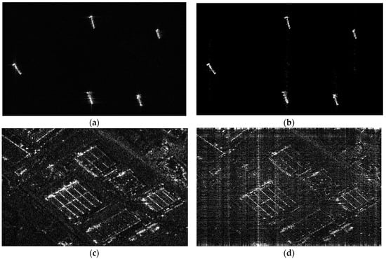 (a) Reconstructed result of ocean containing ships from Nyquist samples based on chirp scaling; (b) Reconstructed result of ocean containing ships from sub-Nyquist samples based on compressive sensing (CS); (c) Reconstructed result of an urban scene from Nyquist samples based on chirp scaling; (d) Reconstructed result of an urban scene from sub-Nyquist samples based on CS.