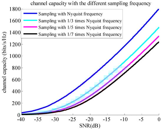 Corresponding to the noise-channel coding theorem, the necessary condition of the successful reconstruction is that the channel capacity should be larger than the information entropy of the scene. The reconstructed matrices of Figure 1a,c is the same, so the channel capacity corresponding to Figure 1a,c is also the same. Similarly, the channel capacity corresponding to Figure 1b,d is also the same. However, the information entropy of the scenes in Figure 1a,c is different, for the ocean with several ships is sparser than the urban scene, so that the information entropy of the urban scene is larger than that of the ocean with several ships. The same is true for the scenes in Figure 1b,d. Comparing the result in Figure 1b with that in Figure 1d, the reason for the result in Figure 1d is that the information entropy of the urban scene is larger than the channel capacity under the sub-Nyquist sampling method. Additionally, the simulation results also show that the channel capacity under the Nyquist sampling method is larger than that under the sub-Nyquist sampling method, comparing the result in Figure 1c with that in Figure 1d, as illustrated in Figure 3. Although the scene information entropy is not quantitatively calculated, the above explanation and inference to the results in Figure 1 are logical according to the simulated results.