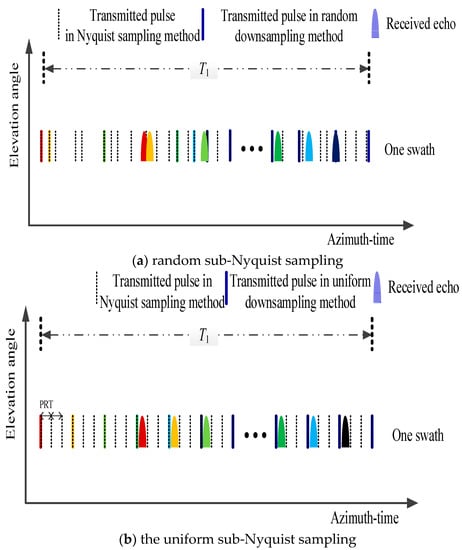 Because the observational distance is far in the spaceborne SAR system, the time interval between transmitting and receiving is several times the Nyquist pulse repetition time (PRT). The system design should ensure that the echo is completely received and avoids the nadir echo. In the random sub-Nyquist sampling method, the received echo may overlap with the transmitted pulse or the nadir echo. Unless a SAR system adopts one way to avoid the overlapping, the random sub-Nyquist sampling method is not feasible, as illustrated in Figure 6a. Considering that it should avoid the overlapping between transmitting and receiving and that the pseudo-random space-time modulation already guarantees the existence of randomness required by reconstruction, sub-Nyquist samples can be achieved by the uniform sub-Nyquist sampling method in this paper.