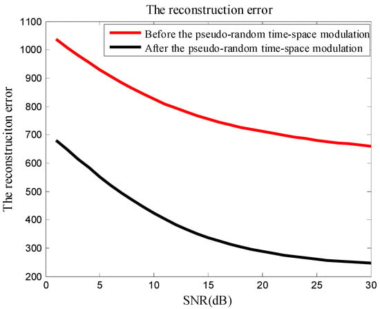 According to the optimization reconstruction performance in Equation (18), Figure 8 shows that the reconstruction error decreases after pseudo-random space-time modulation.