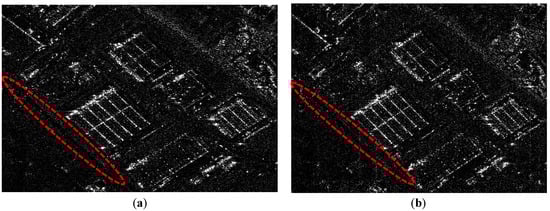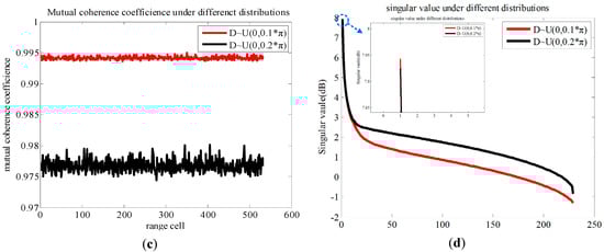 The simulated results in Figure 9 verify the decision to indicate the choice of pseudo-random space-time modulation in Section 4. As previously mentioned, the phase of complex exponent generated by CRA is a stochastic variable. The simulation chooses that the phase has a uniform distribution with different variances to compare and analyze. After pseudo-random space-time modulation, results in Figure 9a,b are successfully reconstructed with sub-Nyquist samples compared to Figure 1d. Results of Figure 9a,b are simulated when the phase of pseudo-random space-time modulation obeys a uniform distribution with different variances. Results of Figure 9c,d denote the curves of mutual coherence coefficient, and singular value amplitude under two distributions. For the convenience of description, assuming the mutual coherence coefficient, the maximum singular value and the minimum singular value under two different random distributions are denoted by uu, ug, βmax_u, βmax_g, βmin_u, and βmin_g, respectively. As illustrated in Figure 9, uu is larger than ug in Figure 9c, βmax_u and βmax_u/βmin_u are larger than βmax_g and βmax_g/βmin_g in Figure 9d, respectively, and more road details are maintained in the red ellipsoid of Figure 9a compared with Figure 9b. It is consistent with Equations (8) and (9) that random phase distribution with large mutual coherence leads to many scene details under guaranteeing the whole error. Pseudo-random space-time can improve the imaging performance, and Equations (8) and (9) indicate the choice of the modulation.
