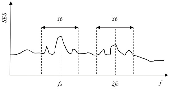 Step4: Calculate the kurtosis of the SES in each frequency band. This is the key step of the algorithm. Not the entire SES but part of it is used to calculate the kurtosis. It is not trivial to detect the third harmonic or higher harmonics in the SES because they may be overwhelmed by the background noise when the SNR of the signal is below 1 [28]. It is also reasonable to say that there is a bearing fault if there are peak values at the fault frequency and the second harmonic in the SES. Therefore, only the SES in the range centred at the fault frequency fa and the second harmonic 2fa, with the span of three times the modulation frequency fr are used to calculate the kurtosis of the SES (see Figure 3). Since the occurrence of the fault frequency is usually accompanied by sidebands, the span is set to three times the modulation frequency to include the first two sidebands. The kurtosis for one node in Figure 2 with a certain central frequency and bandwidth is given as: