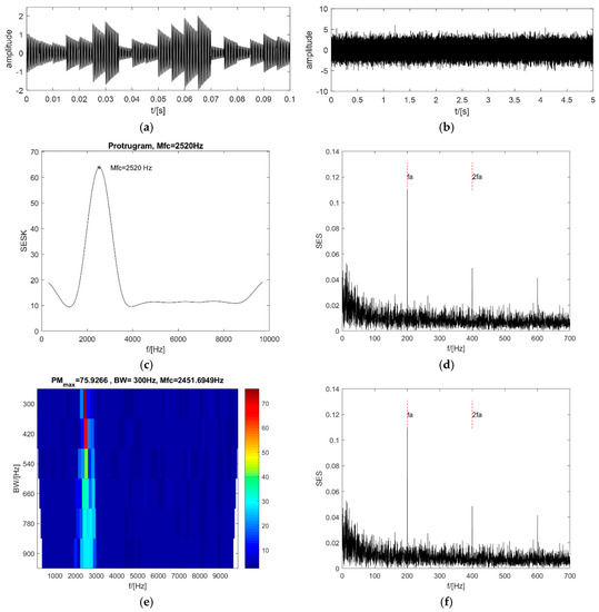 Even though the SNR is high at −6 dB, the maximum value of the protugram occurs at the central frequency of 300 Hz, which is far from the resonance frequency of 2500 Hz (see Figure 6c). The single peak value in the SES of the selected frequency band is near 61 Hz, which is the difference in the resonance frequency of the two sinusoidal signals (see Figure 6d). The PMgram is almost the same as that in Section 4.1. The optimal central frequency is 2483.22 Hz, near the resonance frequency of 2500 Hz (see Figure 6e), and the optimal bandwidth is 420 Hz. The SES of the optimal frequency band clearly indicates the existence of the impacts (see Figure 6f). In contrast, the optimal central frequency of the enhanced kurtogram is 312.5 Hz and the optimal bandwidth is 625 Hz at the fourth level (see Figure 6g). The single peak value in the SES of the optimal frequency band occurs at 61 Hz, which is the same as that of the protugram (see Figure 6h). It is clearly displayed in Figure 6i that the optimal central frequency and the bandwidth of the PMFSgram are 2616.1 Hz and 300 Hz, respectively. The optimal bandwidth is 1.5 times the repetitive frequency of the impacts. The SES of the optimal frequency band can also point out the existence of the impacts quite clearly (see Figure 6j). Both the protugram and the enhanced kurtogram are negatively affected by the single impulse in the SES or the power spectrum of the SE. However, the PMgram and the new method PMFSgram are not affected. Thus, the ability of the new method to resist the interference of a single impulse in the SES is proved.