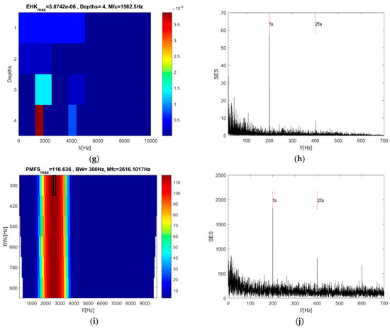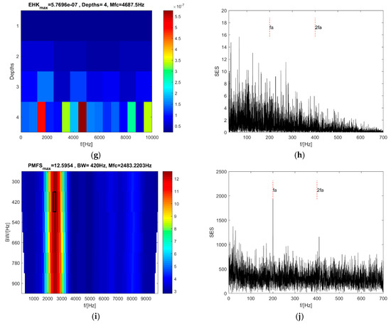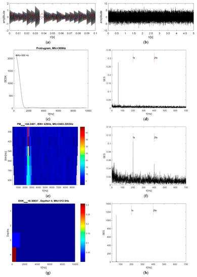 When the SNR of the signal in Section 4.1 decreases to −12 dB (see Figure 5a,b), even though there is still a peak value near the resonance frequency in the protugram, the optimal central frequency is selected automatically using the maximum kurtosis of the SES is 300 Hz (see Figure 5c), and the SES of the selected optimal frequency band is unable to point out the existence of the impacts (see Figure 5d). By contrast, the PMgram can still select an optimal central frequency close to the resonance frequency of the impacts at 2483.22 Hz, and the optimal frequency bandwidth is 420 Hz (see Figure 5e). The SES of the optimal frequency band of the PMgram is a bit weaker than in Section 4.1, but it still can indicate the existence of the impacts clearly (see Figure 5f). The enhanced kurtogram is displayed in Figure 5g, in which the optimal central frequency is 4687.5 Hz and the optimal bandwidth is 625 Hz at the fourth level. But in Figure 5h the SES of the optimal frequency band of the enhanced kurtogram has difficulty detecting the impacts. However, it is shown in Figure 5i that the optimal central frequency is 2483.22 Hz and the optimal bandwidth is 420 Hz for the PMFSgram. The optimal bandwidth is 2.1 times of the repetitive frequency of the impacts. The corresponding SES of the optimal frequency band is displayed in Figure 5j and indicates the existence of the impacts clearly. This case has proved that the new method is capable of detecting the impacts even though the noise is very heavy.