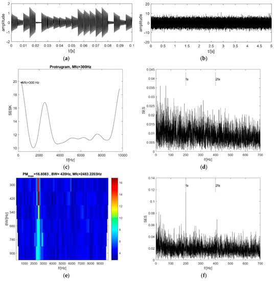 A series of impacts with a high repetition rate are generated based on Ref. [16,28]. A single impact is generated by a single degree-of-freedom damping oscillation system with an amplitude of 1, a resonance frequency of 2500 Hz, and a decaying coefficient of −100. The amplitude of the whole signal has a 10% fluctuation, and the period of the signal has a jitter of 5%. The length of the signal is 105 and the sampling frequency is 20,000 Hz. The repetition rate of the impact is 200. A white Gaussian noise with SNR = −6 dB is added to the signals. The corresponding analysis results are shown in Figure 4.