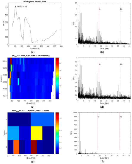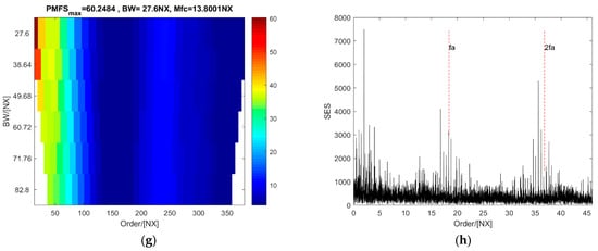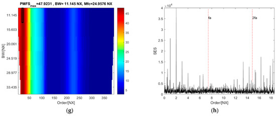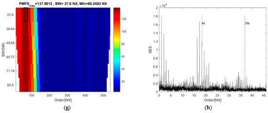 It is displayed in Figure 14a that the optimal central order of the protugram is 69.10 NX. It is difficult to show that it identifies the defect on the roller well, because the SES of the optimal order has only a very weak value at the second harmonic of the fault order (see Figure 14b). However, there is a clear peak value at the second harmonic of the fault order in the SES of the optimal order band of the PMgram (see Figure 14d). Furthermore, the optimal central order is 24.23 NX, and the optimal bandwidth is 20.06 NX. In contrast, it can be seen from Figure 14f that both values at the fault order and its second harmonic are close to 0 in the SES of the optimal order band of the enhanced kurtogram. But there are peak points at 1, 3, and 4 NX obviously. The optimal central order in the enhanced kurtogram is 73.88 NX and the optimal bandwidth is 49.6 NX at the third level (see Figure 14e). It is shown in Figure 14g that the optimal central order of the PMFSgram is 24.96 NX and the optimal bandwidth is 11.15 NX. The optimal bandwidth is 1.5 times of the fault order. The SES of the optimal order band of PMFSgram (Figure 14h) is almost the same as that of PMgram. Even though there is only a peak value at the second harmonic of the fault order, it still indicates there is a defect on the roller.