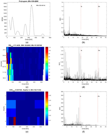 The maximum value of the protugram occurs at order 339.48 NX (see Figure 12a). It is displayed in Figure 12b that the SES of the optimal order band has two peak values far from the fault order and values at the first two harmonics of fault order are masked in the noise. Compared with the SES of the optimal order band of the protugram, there are two peak values at the fault order and the second harmonic in the SES of the optimal order band of the PMgram (see Figure 12d). The optimal central order of the PMgram is 19.32 NX and the optimal bandwidth is 38.64 NX (see Figure 12c). In contrast, the optimal central order of the enhanced kurtogram is 120.75 NX and the optimal bandwidth is at the fourth level with the value of 34.5 NX (see Figure 12e). Even though the SES of the optimal order band can indicate the existence of a fault on the outer ring, the value at the fault order is quite weak (see Figure 12f), and a strong impulse occurs at order 2 NX. However, it is clearly shown in Figure 12h that there are two peak values at the fault order and the second harmonic, which indicates the existence of a fault on the outer ring apparently. The optimal central order of the PMFSgram is 68.05 NX and the optimal bandwidth is 27.6 NX displayed in Figure 12g. The optimal bandwidth is 1.5 times of the fault order. In this case, both protugram and the enhanced kurtogram select an optimal order band with few peak points in the SES of the optimal order band but are impossible to identify the defect. The performance of PMFSgram and PMgram are almost the same and superior to the other two.