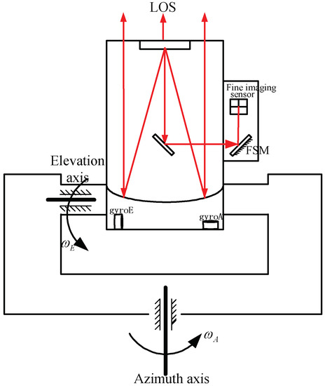 Electro-optical tracking systems (EOTSs) are widely used in laser communications, optical imaging, target tracking and so on. Besides, they are beginning to be increasingly mounted on vehicles, shipboard, airplanes, spacecraft and other moving platforms [1,2,3,4]. Maintaining line-of-sight (LOS) orientation toward a target will be particularly challenging when the EOTS is carried on the moving platform or when the target is highly dynamic. The stabilization of LOS is fundamental for high precision target tracking. An electro-optical tracking system consists of the two axes (or three axes) gimbal and a fast steering mirror (FSM). Gimbal serves as the main axis to realize coarse tracking and disturbance suppression in a large range, and FSM serves as the auxiliary axis to realize target fine tracking [1,5].