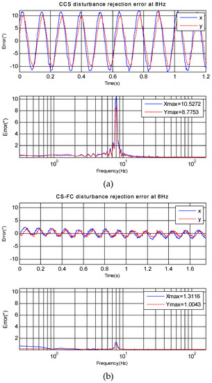 X-axis and Y-axis disturbance rejection error at 8 Hz. (a) disturbance rejection error of CCS; (b) disturbance rejection error of CS-FC.