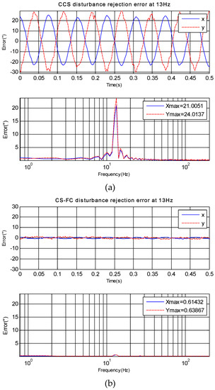 X-axis and Y-axis disturbance rejection error at 13 Hz. (a) disturbance rejection error of CCS; (b) disturbance rejection error of CS-FC.